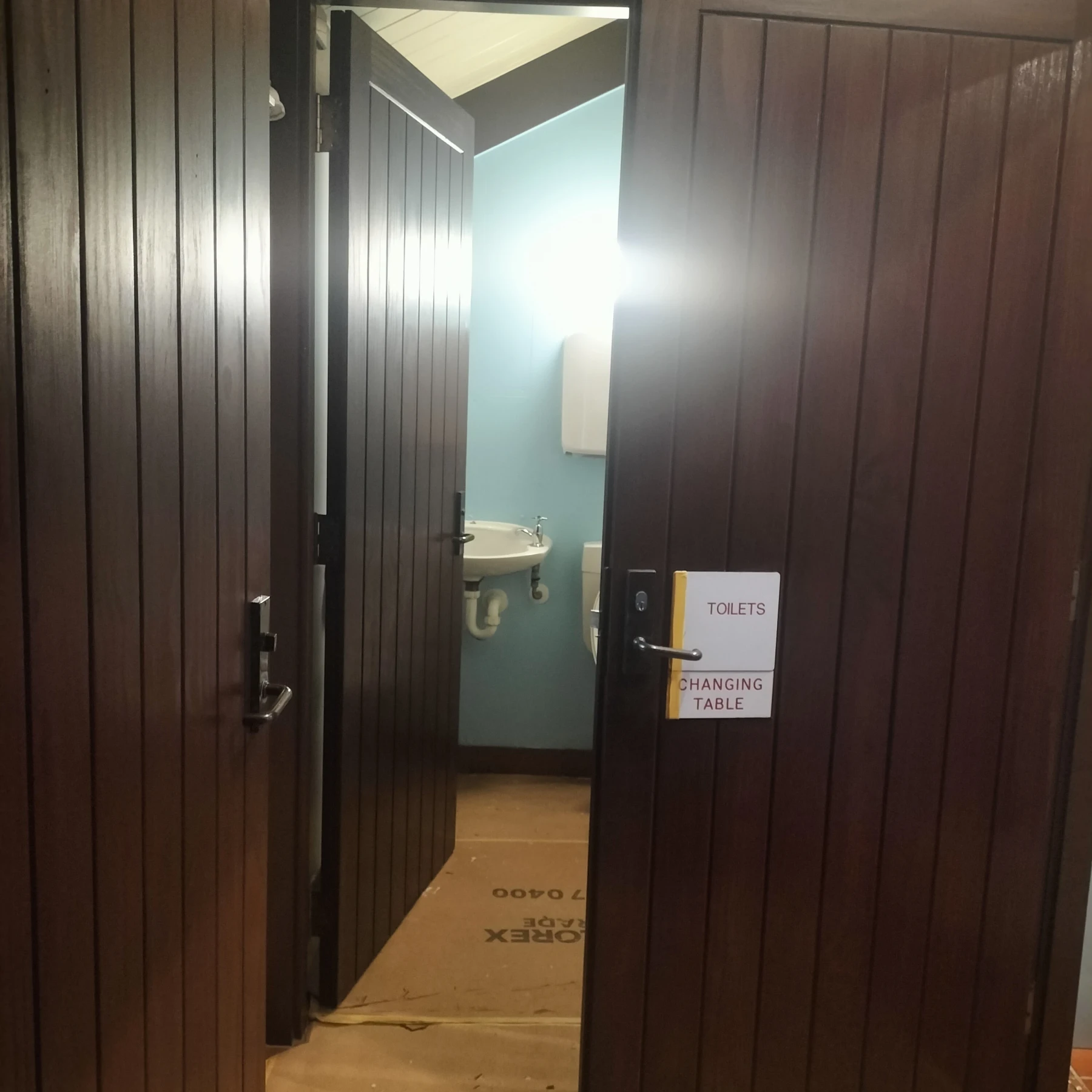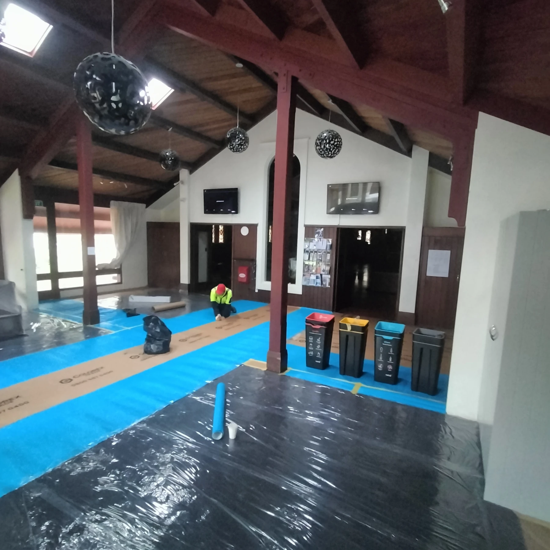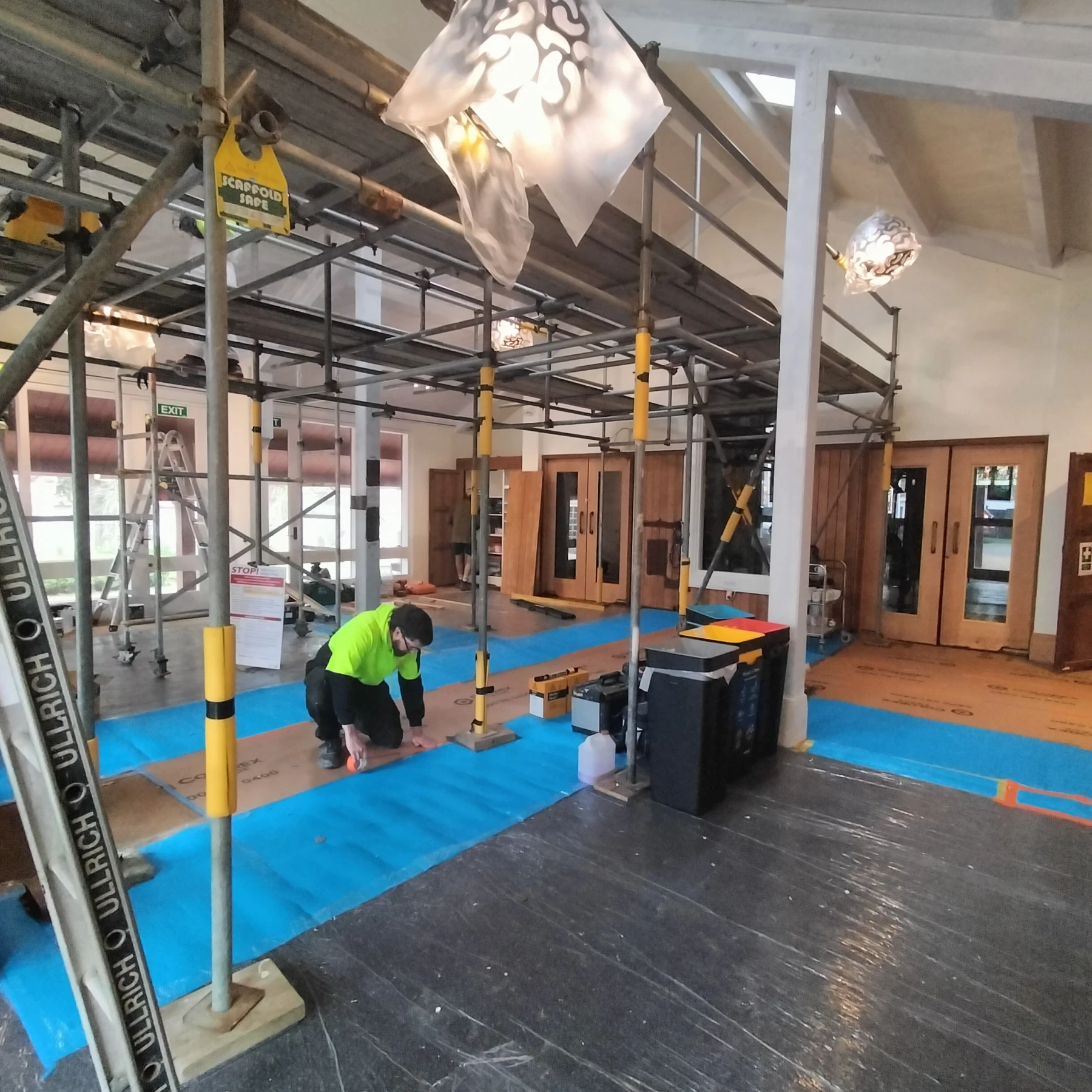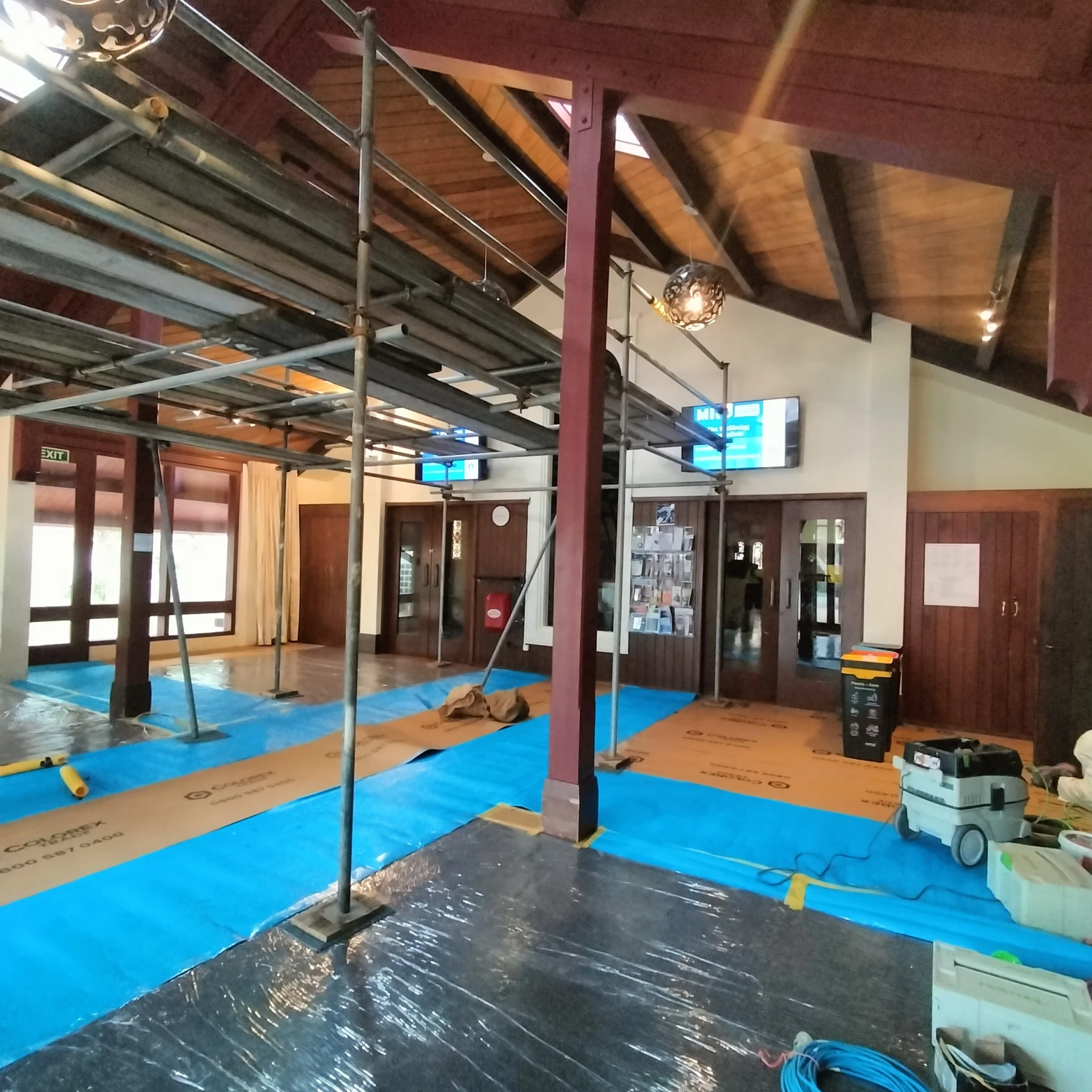 Preparation began with comprehensive floor protection - two layers of protective sheeting across the entire foyer floor. This ensured the original flooring remained untouched throughout the scaffolding setup and preparation & painting stages.