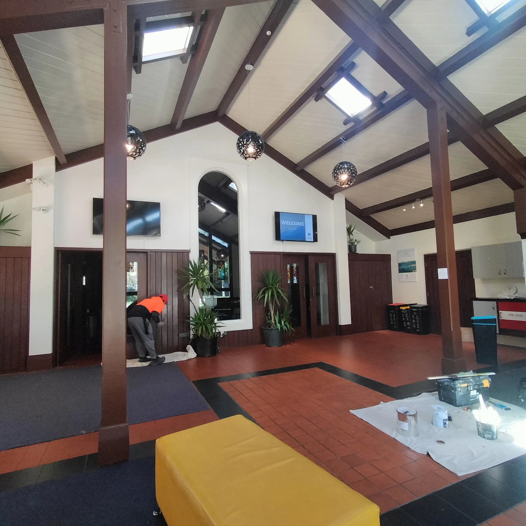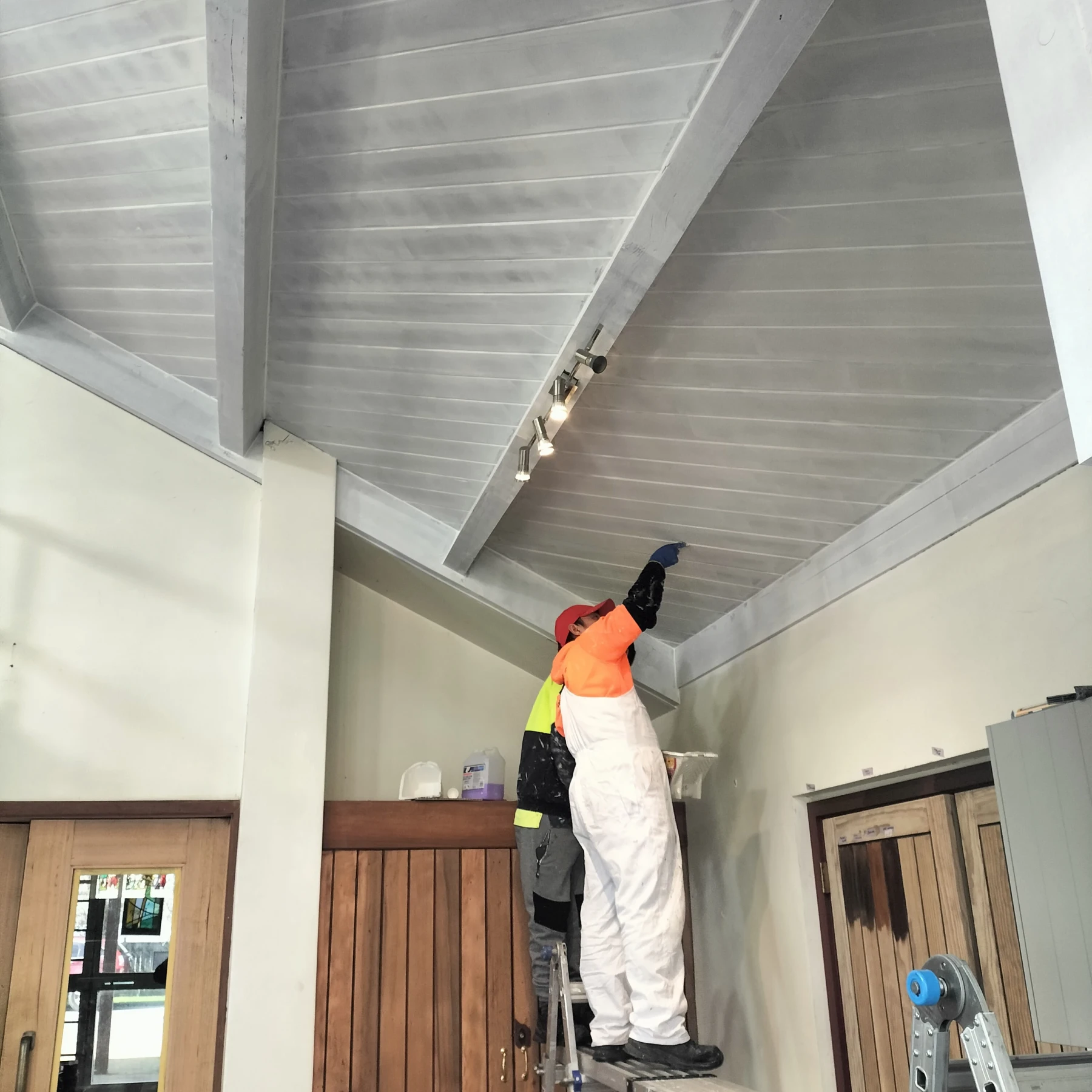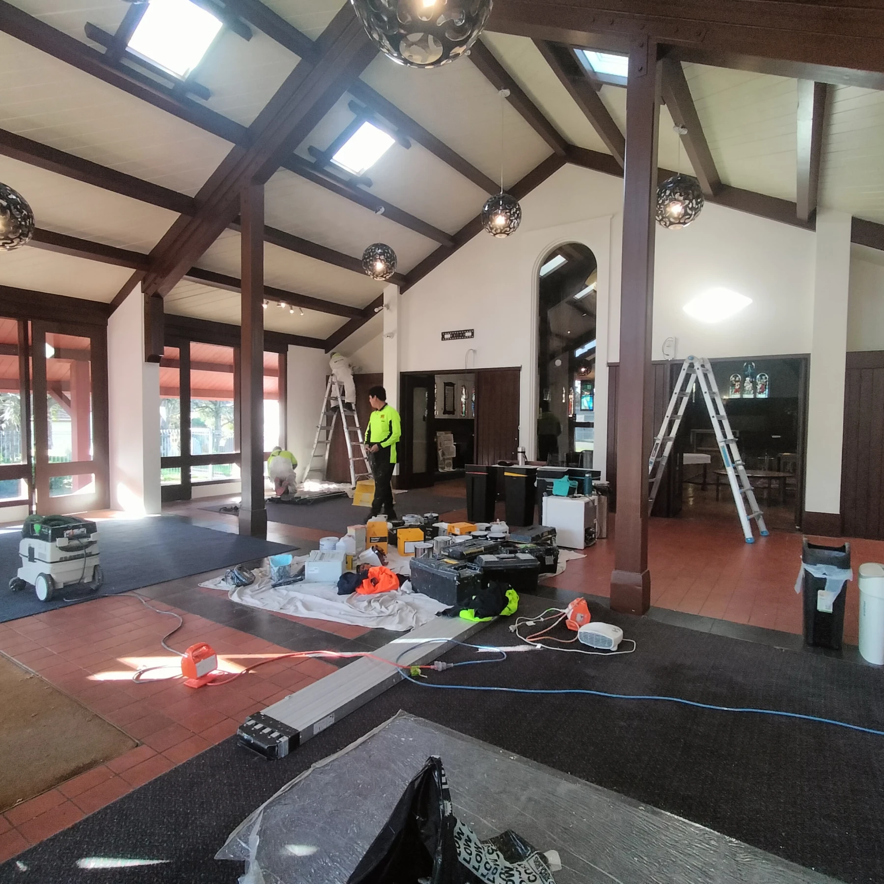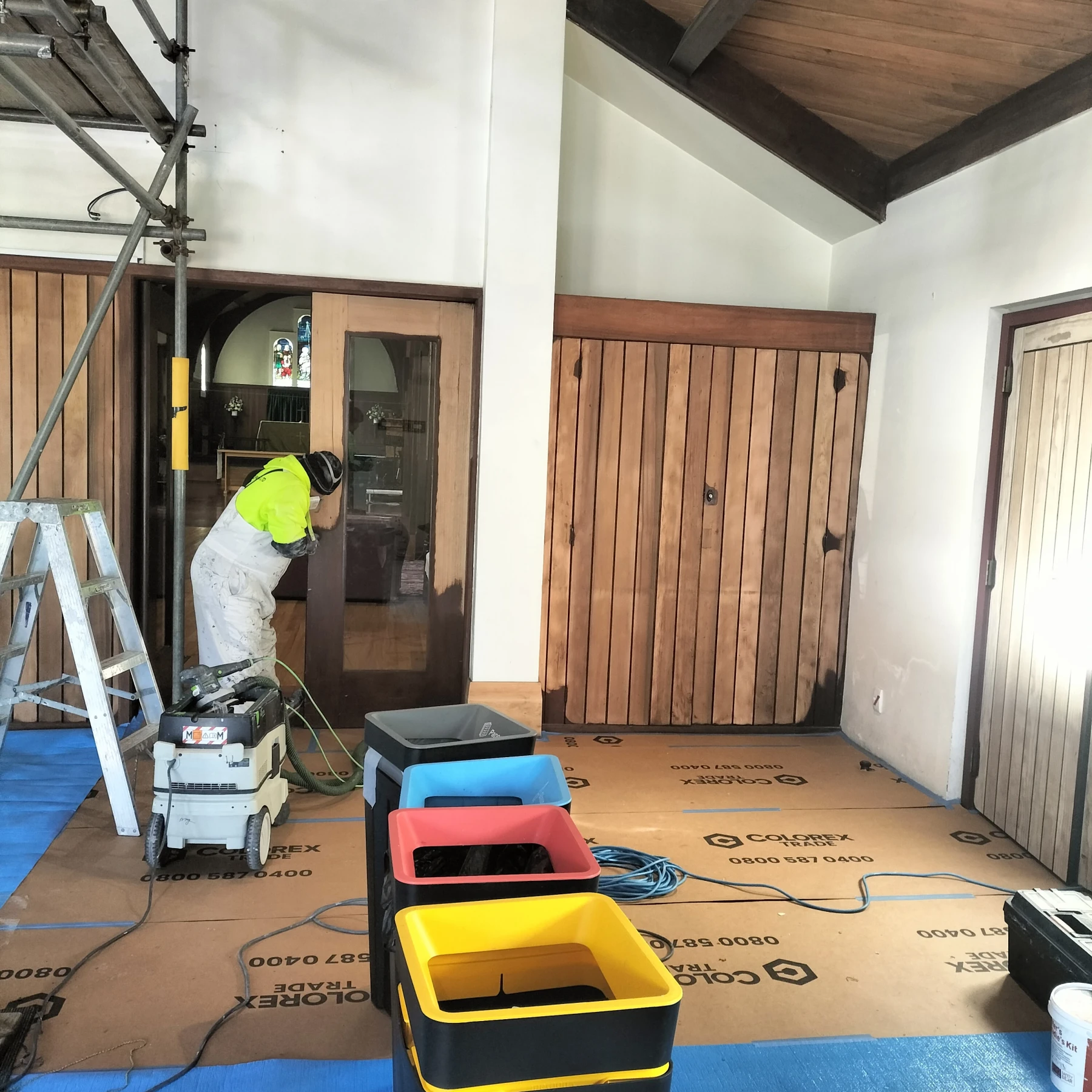 Once access was in place, we turned our focus to the extensive timber features throughout the foyer. Every surface was carefully sanded to ensure proper adhesion of new finishes. As part of the prep work, we also carried out a number of minor building repairs which would have been difficult to see or access prior to scaffold set up. The final stage involved applying a combination of paint and stain finishes, tailored to highlight the natural warmth of the timber while complementing the church’s interior character. A big change!