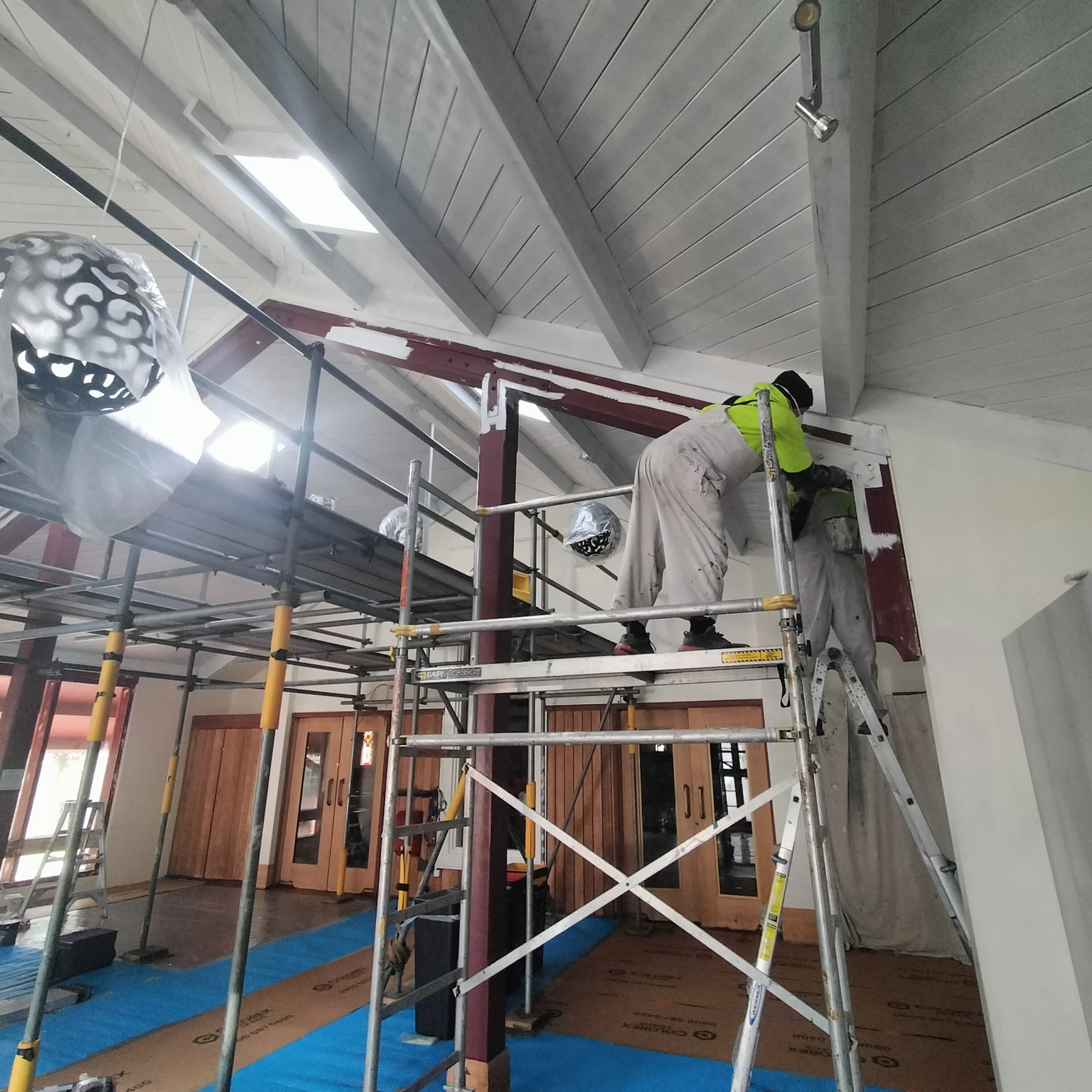 Due to the height and complexity of the foyer layout, we installed a ring-lock scaffolding system running centrally through the space. Mobile scaffolds were also positioned on either side to provide full coverage and safe access to all surfaces, while also serving as fall protection. Safety for both our team and the site was a top priority.